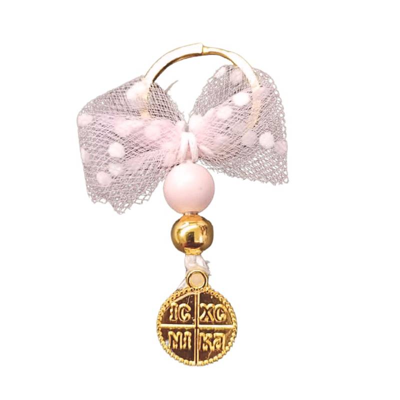 Περιγραφή Μαρτυρικό με Φιόγκο από τούλι Ροζ Λευκό πουά, Χάντρες και Χρυσό Σταυρουδάκι