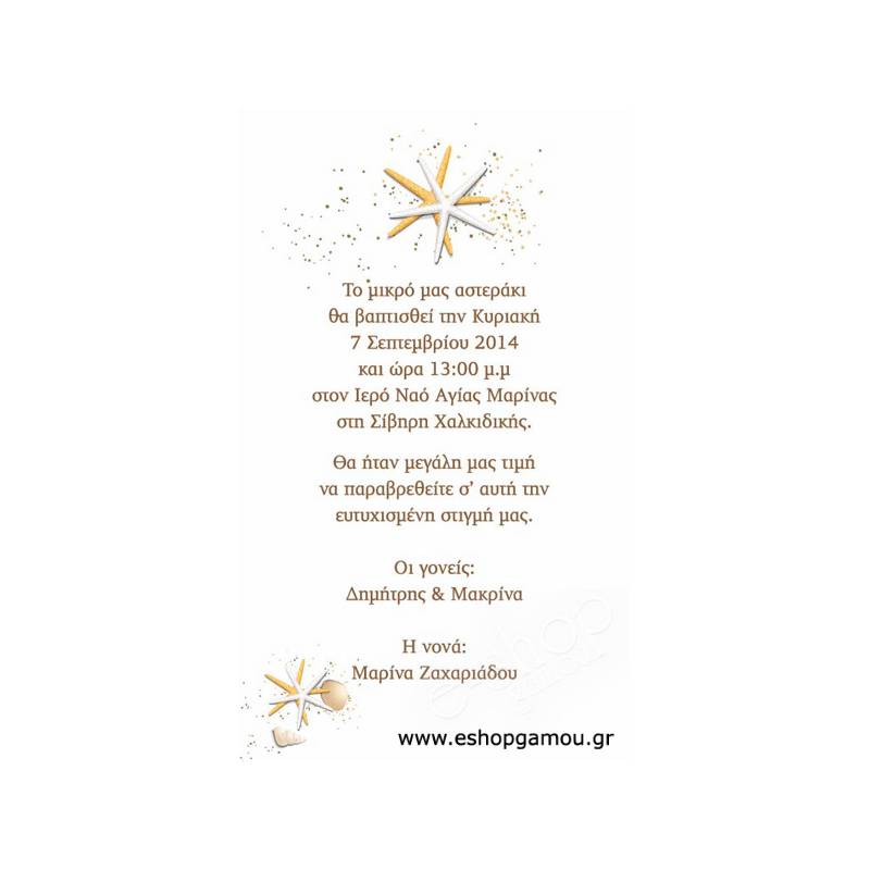 Μετά την παραγγελία μας στέλνετε το κείμενο του προσκλητηρίου με email στο info@eshopgamou.gr και σας στέλνουμε πίσω την μακέτα με το δικό σας κείμενο και στοιχεία.