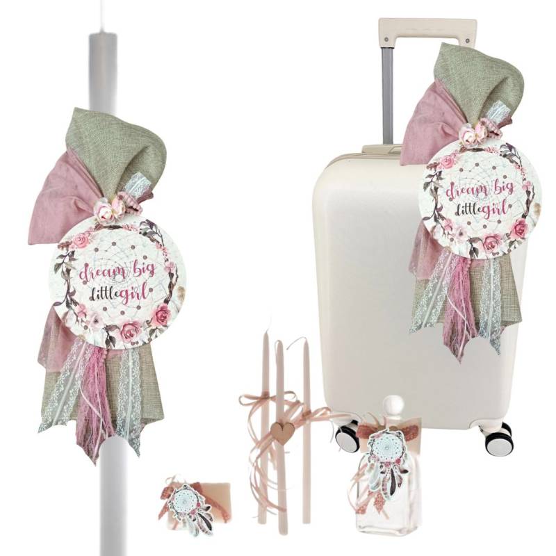 Σετ Βάπτισης Στολισμένο με Ονειροπαγίδα, Γάζα και Κορδέλες σε Αποχρώσεις Σάπιο Μήλο, Ιβουάρ και Φυσικό.Το Σετ περιλαμβάνει Βαλίτσα απο Δερματίνη Ιβουάρ Περλέ, Λαμπάδα Βάπτισης και Σετ Λαδικού.