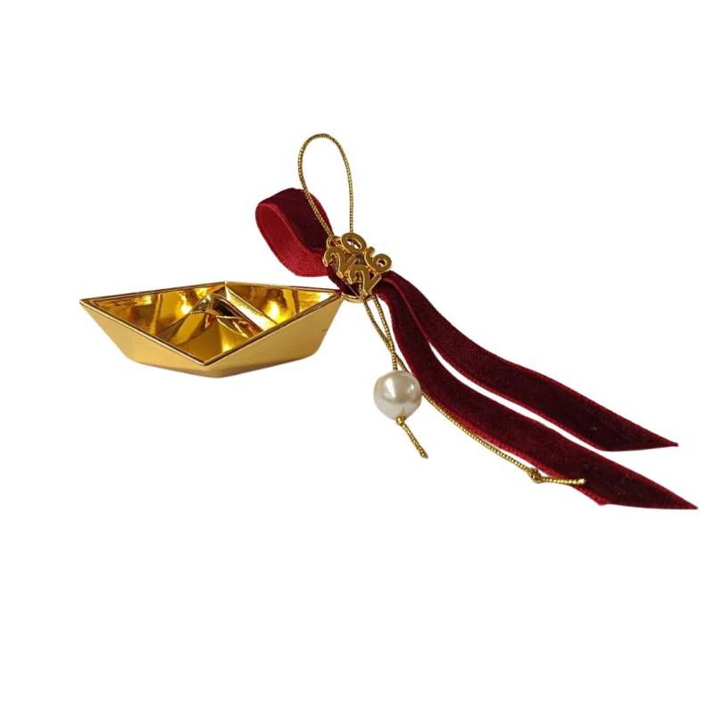 Περιγραφή Γούρι Μεταλλική Βαρκούλα Χρυσή, Με κορδελίτσα Μπορντώ Βελούδινη και Πέρλα