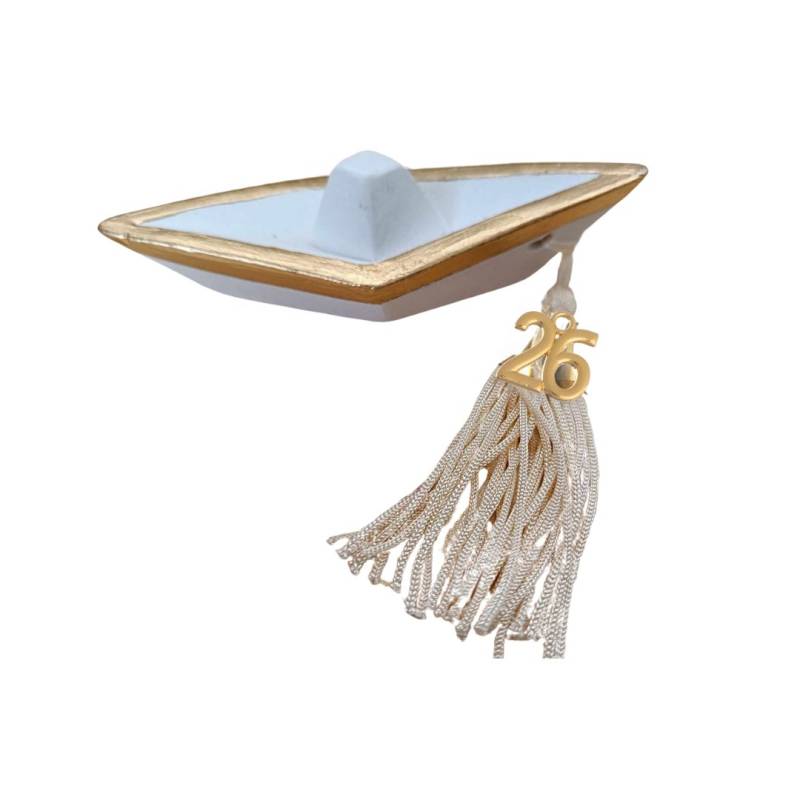 Περιγραφή Γούρι με Κεραμικό Καράβι σε Αποχρώσεις Μπεζ-Λευκό-Χρυσό.