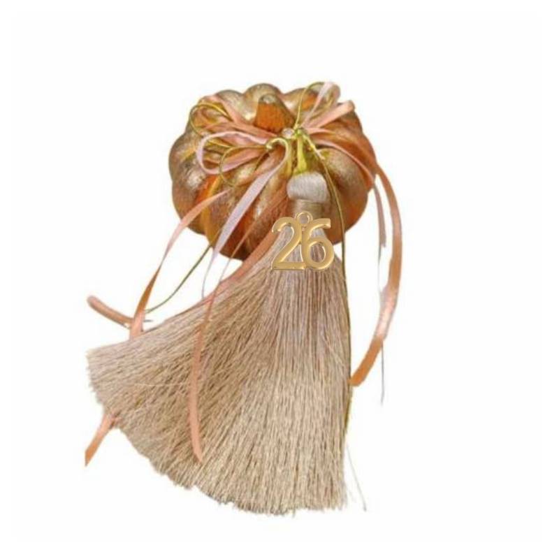 Περιγραφή Γούρι με Κεραμική Κολοκύθα, Φούντα Μεγάλη Ιβουάρ και Ημερομηνία.
