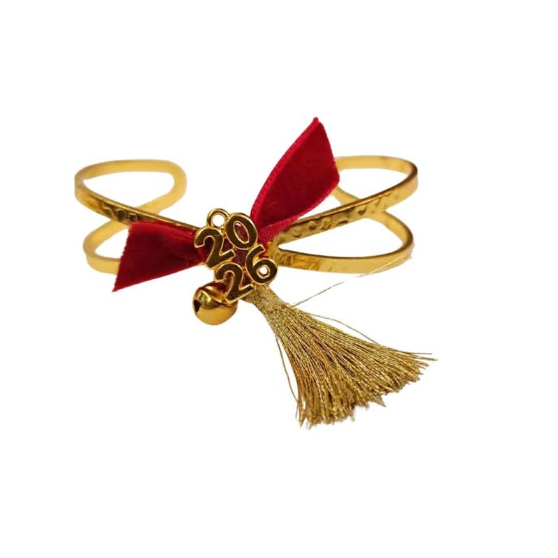 Γούρι Διπλό Μεταλλικό Βραχιόλι με Φουντίτσα Χρυσή, Κουδουνάκι και Μεταλλική Ημερομηνία.