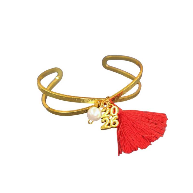 Γούρι Διπλό Μεταλλικό Βραχιόλι με Φουντίτσα Κόκκινη, Πέρλα και Μεταλλική Ημερομηνία.
