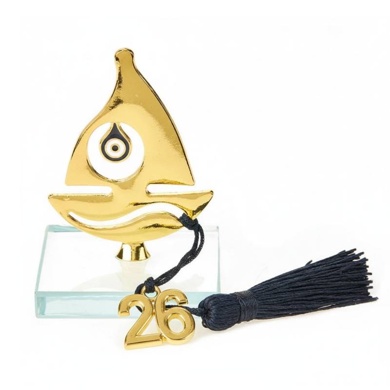 Περιγραφή Γούρι Μεταλλικό Καραβάκι σε Γυάλινη Βάση, Στολισμένο με Μπλέ Σκούρη Φούντα και Μεταλλικό "25" σε Χρυσό.