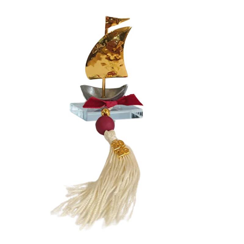 Περιγραφή Γούρι με Μεταλλικό Καράβι σε Γυάλινη Βάση που περιλαμβάνει Φούντα και