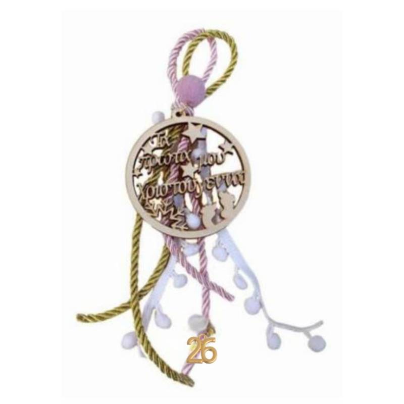 Περιγραφή Γούρι Ξύλινο τα πρώτα μου Χριστούγεννα με μεταλλικό "25" σε ροζ και