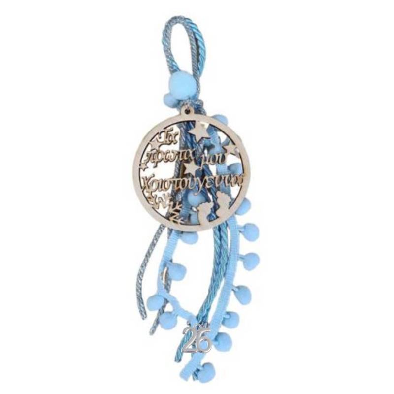 Περιγραφή Γούρι Ξύλινο τα Πρώτα μου Χριστούγεννα με μεταλλικό "25" σε σιέλ και