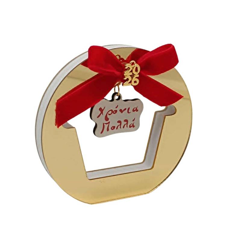 Γούρι Ξύλινη Βάση ντυμένη με Plexiglass (και οι 2 όψεις), με Διάτρητο Σπιτάκι, Ταμπελάκι Ξύλινο Χρόνια Πολλά και κορδέλα Βελούδινη.