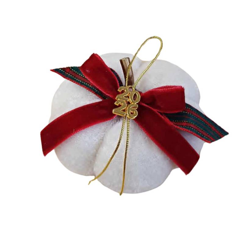 Περιγραφή Κολοκύθα βελούδινη Κόκκινη με Καρώ Κορδέλα, Φούντα Ιβουάρ και "2026".