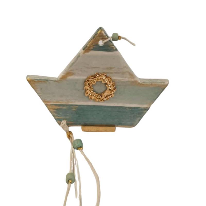 Κεραμικό Καραβάκι Κρεμαστό Λαδί με Στεφανάκι 12Χ9,5εκ.