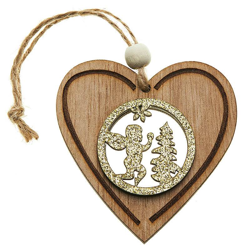 Περιγραφή Ξύλινο Στολίδι Καρδιά με Αγγελάκι και Δέντρο σε Χρυσό Γκλίτερ, κατάλληλο