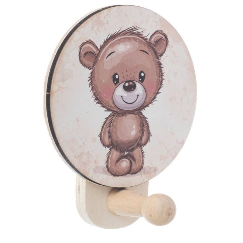 Ξύλινη διακοσμητική στρογγυλή κρεμάστρα τοίχου με τυπωμένο Αρκουδάκι.