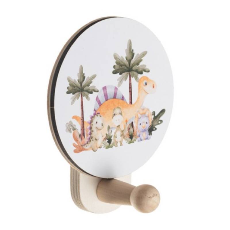 Ξύλινη διακοσμητική στρογγυλή κρεμάστρα τοίχου με τυπωμένους Δεινόσαυρους.