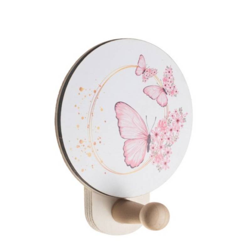 Ξύλινη διακοσμητική στρογγυλή κρεμάστρα τοίχου με τυπωμένες Πεταλούδες και Λουλούδια.