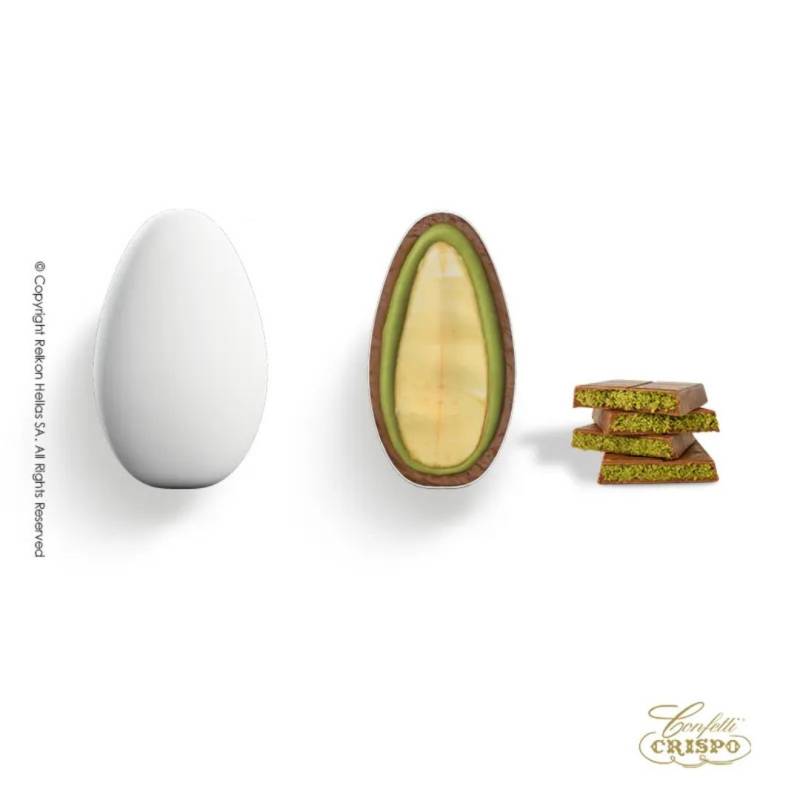 Ολόκληρο καβουρδισμένο αμύγδαλο, γέμιση λευκής σοκολάτας με γεύση λεμόνι και λεπτή επίστρωση ζάχαρης.